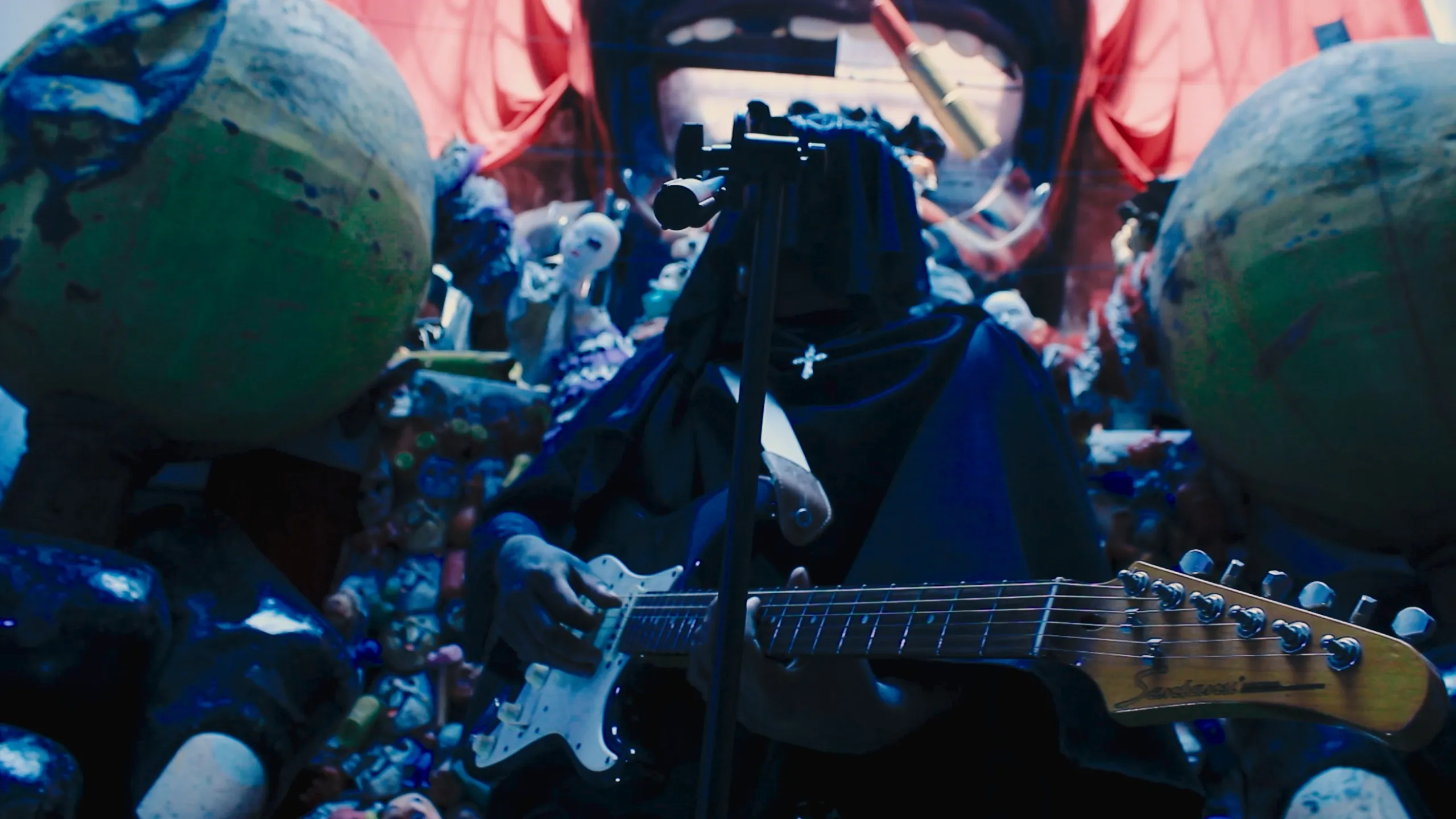 Desde el primer segundo, la narrativa visual establece un choque entre lo sagrado y lo profano. Ian aparece como un sacerdote gótico, un personaje nacido del dramatismo del post-punk y de la espiritualidad retorcida que habita dentro del género. Su presencia escénica —pálida, solemne, casi litúrgica— contrasta con la energía contenida del público: punks vestidos de negro, ocultos tras máscaras y cadenas, que observan con devoción el sacrificio en el escenario. Lo que inicia como un concierto se transforma en un rito, un espacio donde la música deja de ser entretenimiento y se convierte en ofrenda.